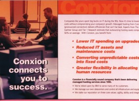 Conxion provided managed hosting -- a nimble solution for companies who needed to quickly add new servers and software. I identified that two of the major benefits for Conxion customers included 1) Converting unpredictable costs into fixed costs, and 2) Reducing IT assets and maintenance costs.
